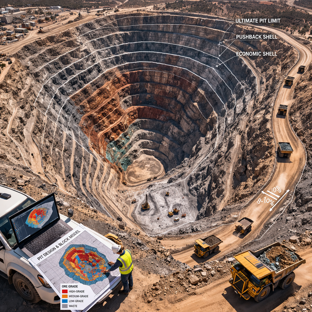Optimum pit design is the art of shaping the mine to chase the ore. It combines physics, economics, and geometry to keep the stripping ratio in sync with profitability rather than in opposition to it.