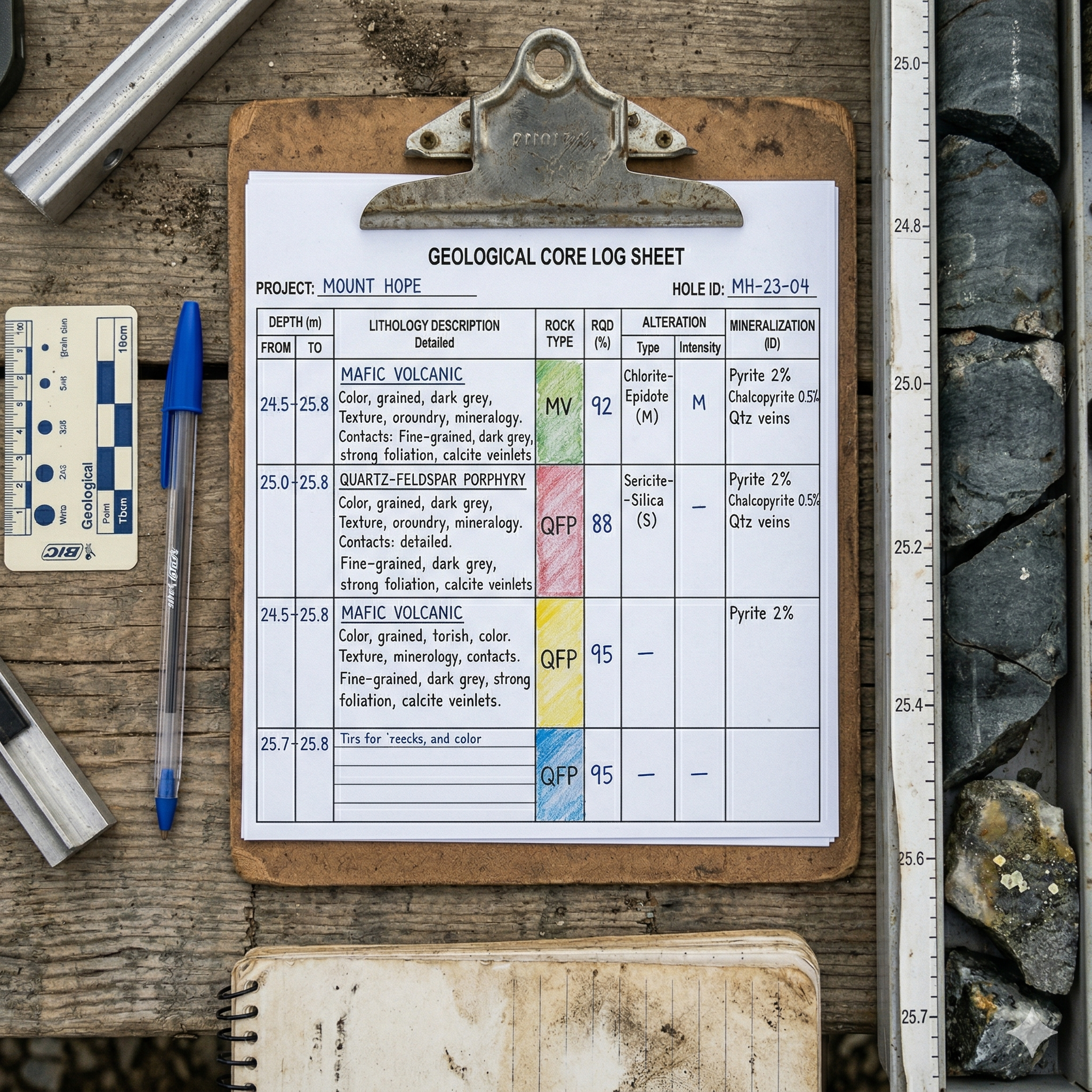 The interpretation of drill core logs is a fundamental process in mineral exploration, serving as the primary bridge between raw subsurface data and the development of 3D resource models. To accurately determine ore continuity and grade distribution, geologists must synthesize lithological, structural, and geochemical data from the core (Kramer Bernhard et al., 2020).