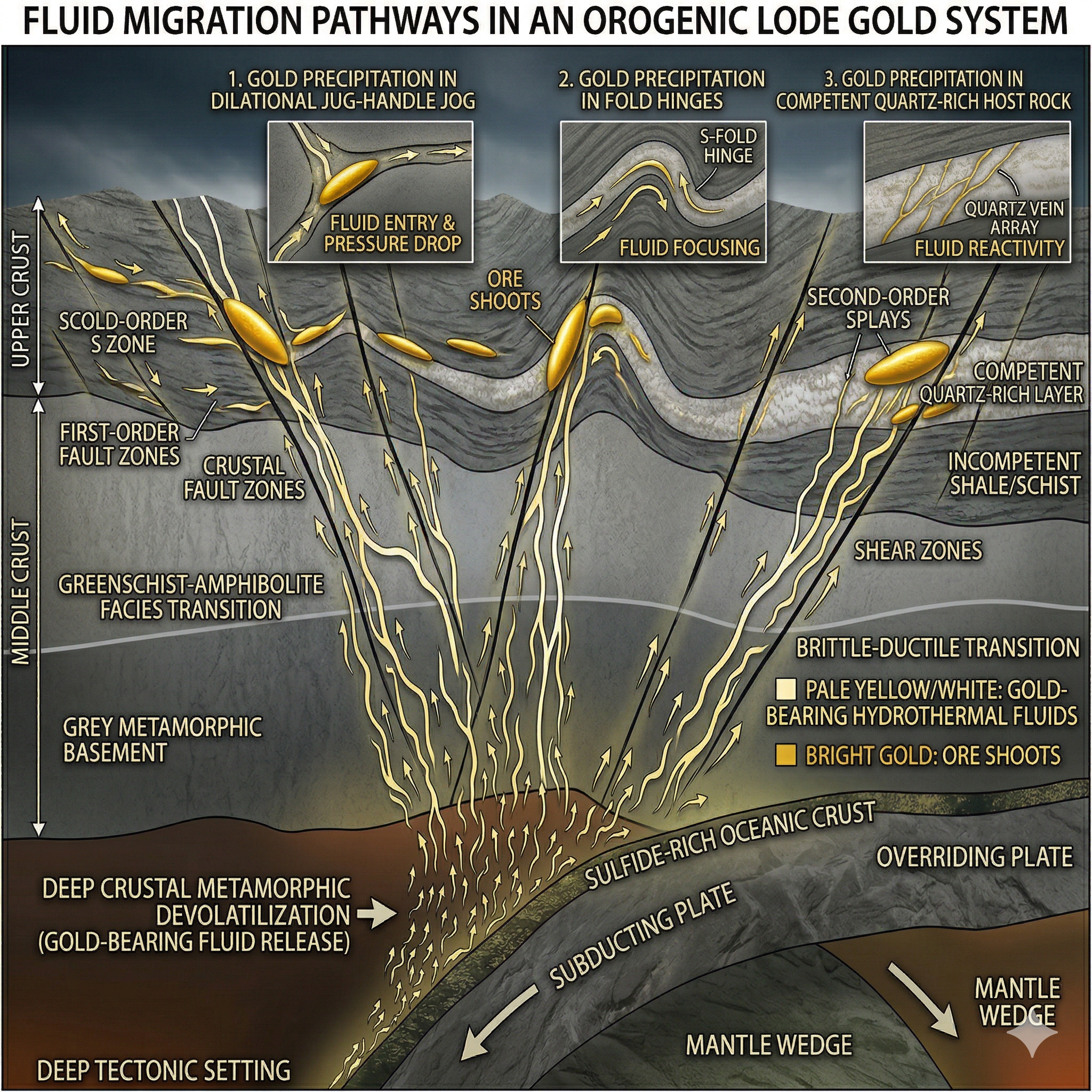 Instead, mineralization is typically localized within second- or third-order faults and splays. These smaller branches provide the necessary permeability for fluids to pool and react. Depending on the depth and pressure, these “traps” manifest as brittle fractures, ductile shear zones, or fold hinges. A key mechanism here is the “fault-valve” process: as seismic events trigger sudden shifts in fluid pressure, the system essentially “breathes,” leading to the episodic precipitation of gold within quartz veins (Groves et al., 1998).