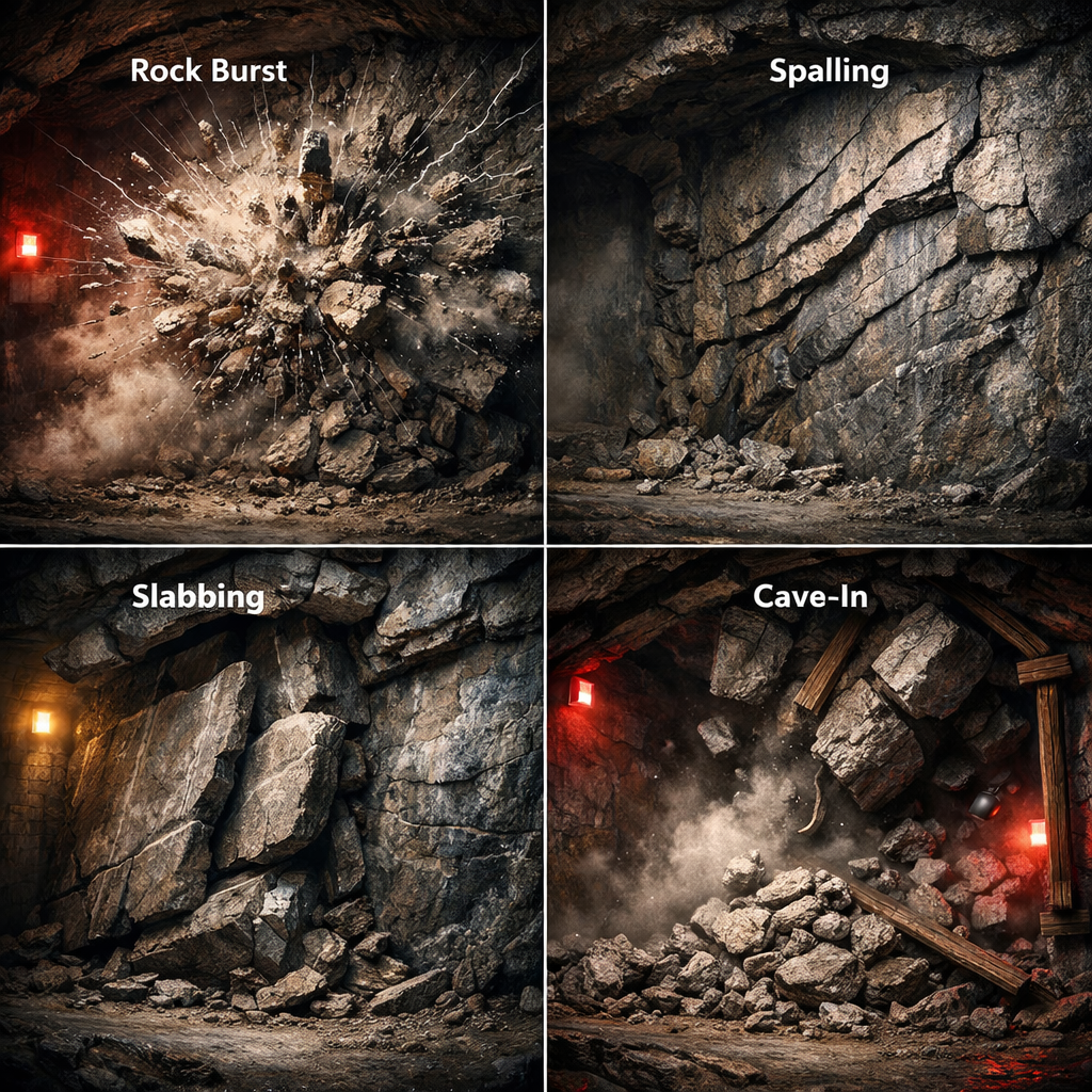 Understanding the mechanics of ground failure is fundamental to safe underground mining and tunnelling. As excavations extend to greater depths, the stress conditions change, leading to distinct types of rock mass deformation and collapse. The primary failure modes include rock bursts, spalling, slabbing, and cave-ins, each with unique characteristics and causes.