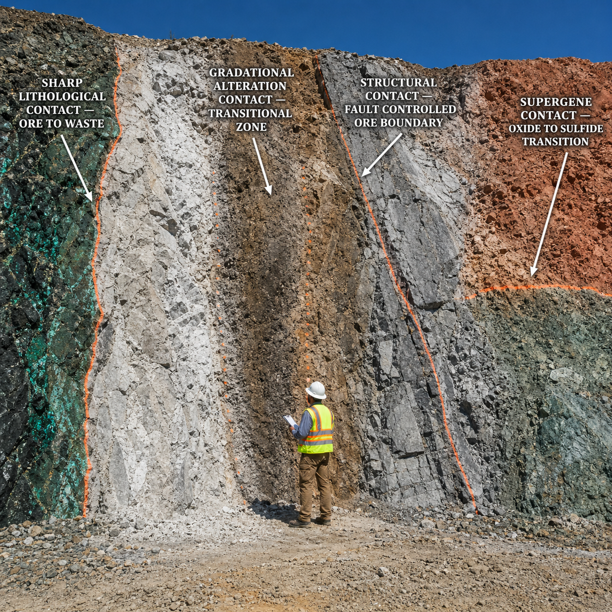 Contact determination is always an interpretation and never merely a measurement. Contact position varies based on sampling interval, assay backing, cut-off grade, complexity of structure, and the nature of the boundary (hard vs soft) in the geologic model.